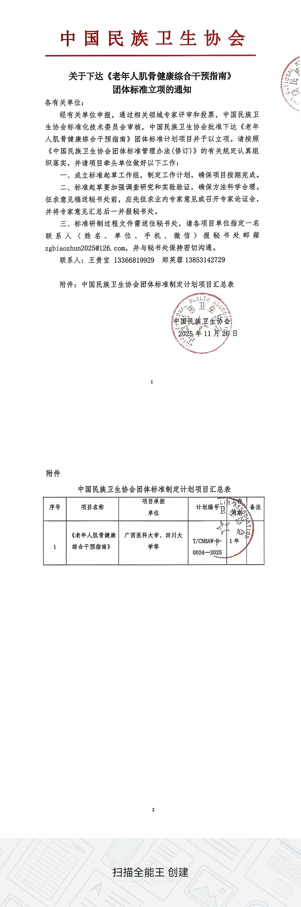 关于下达《老年人肌骨健康综合干预指南》团体标准立项任务的通知