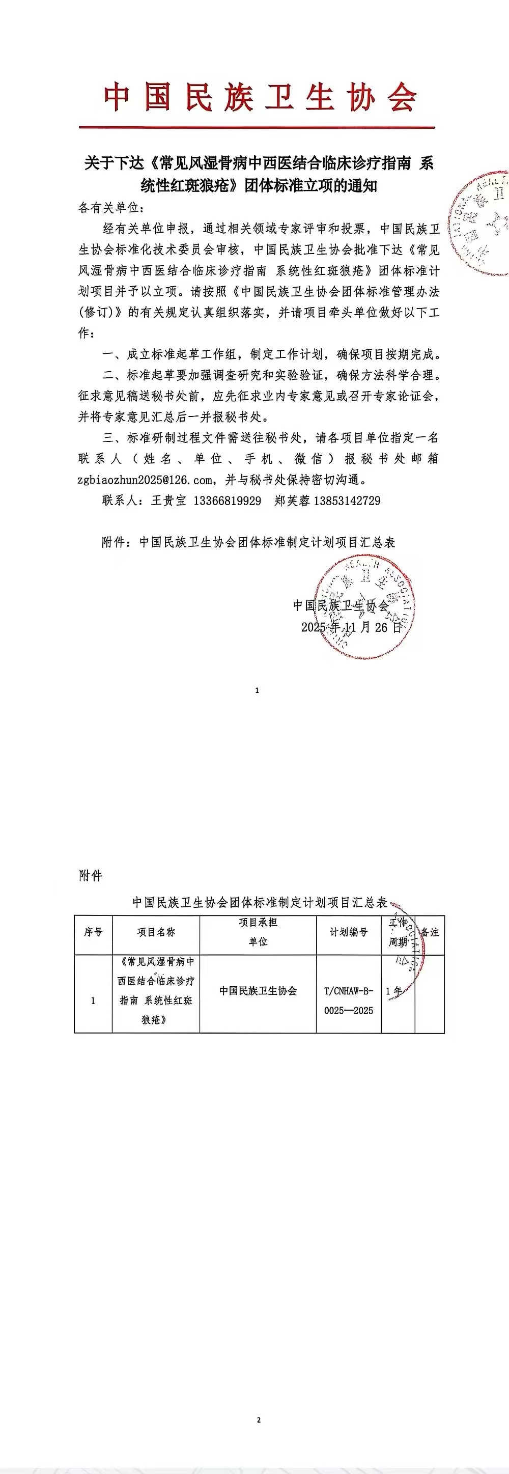 关于下达《常见风湿骨病中西医结合临床诊疗指南 系统性红斑狼疮》团体标准立项的通知