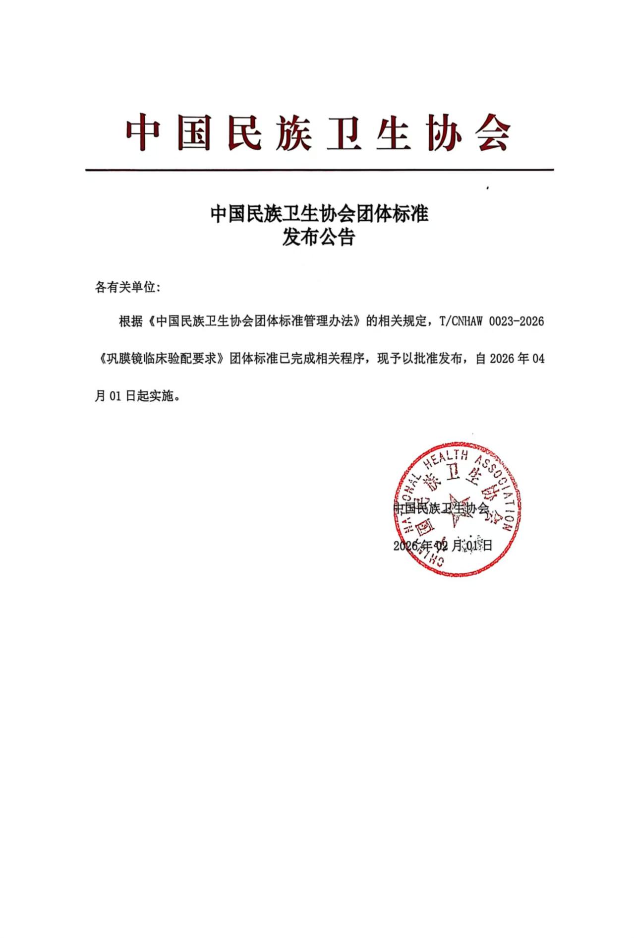 中国民族卫生协会团体标准发布公告