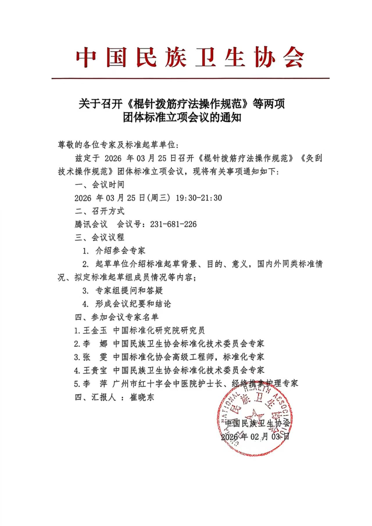 《棍针拨筋疗法操作技术规范》等5项中医技术团体标准立项会议通知