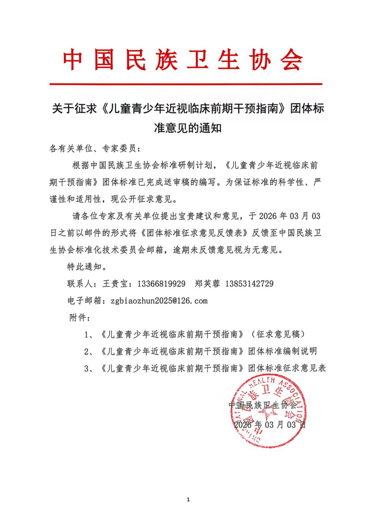 关于征求《儿童青少年近视临床前期干预指南》团体标准意见的通知